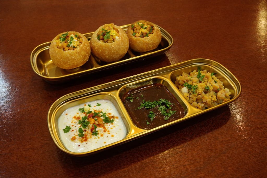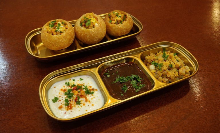 Beloved Indian street food snack, known for its small, hollow, fried dough balls (puri) filled with spiced potatoes, chickpeas, and tamarind chutney.