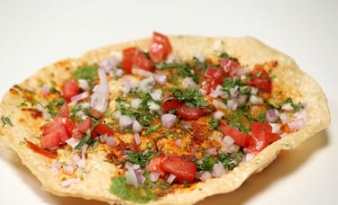 Crispy papadam topped with fresh onions, tomatoes, herbs, and spices for a crunchy, tangy bite.