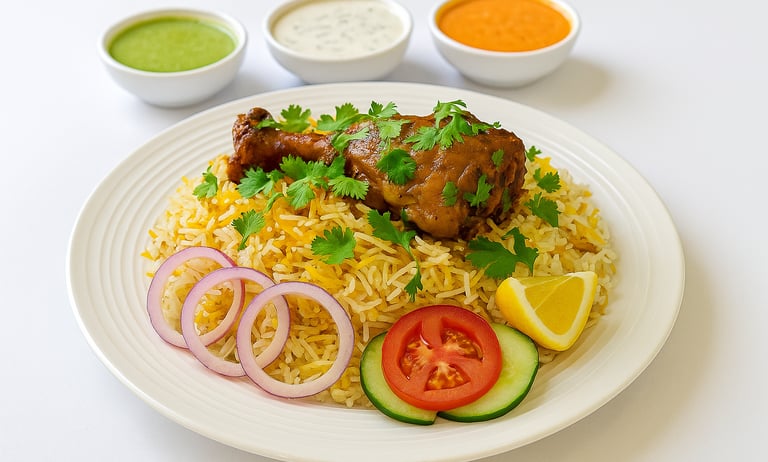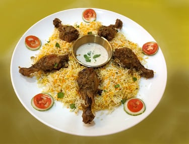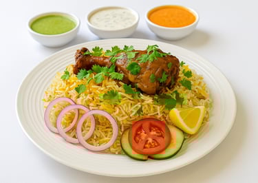 Fragrant basmati rice with tender chicken, aromatic spices, and herbs. A royal blend of flavor and aroma, for the perfect Indian feast.