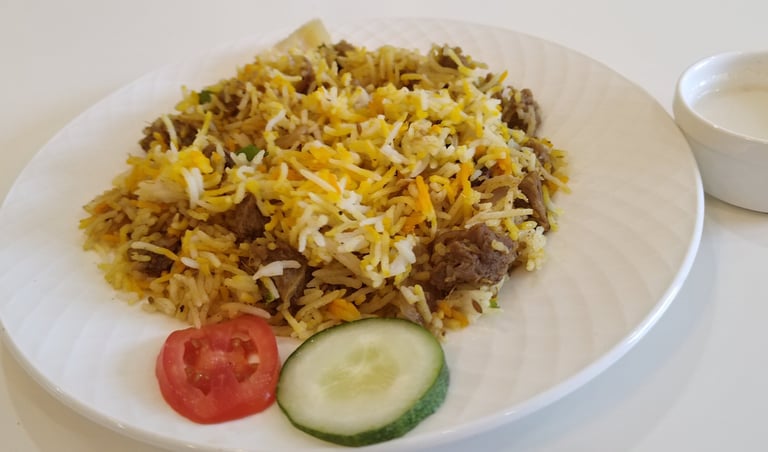 Tender beef slow-cooked with aromatic basmati rice, rich spices, and herbs. A hearty, flavorful biryani bursting with authentic Indian taste and tradition.